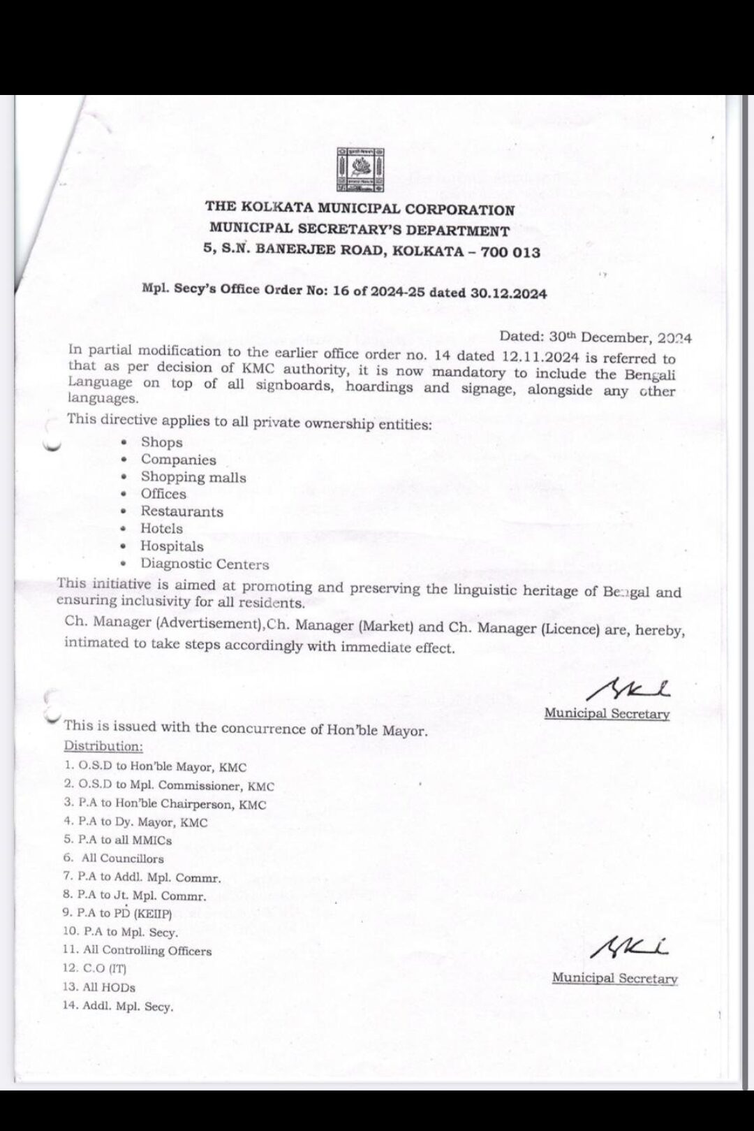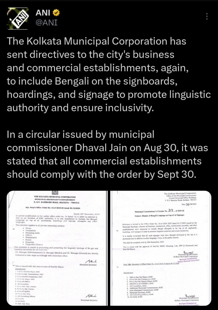 सभी व्यावसायिक प्रतिष्ठानों को लगाने होंगे बंगला मे साइन बोर्ड और होर्डिंग्स :कोलकाता नगर निगम ने जारी किया आदेश
